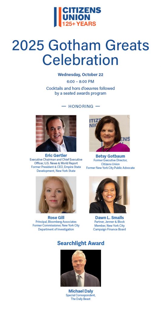 Mark your calendars! On Wednesday, October 22nd, Citizens Union will gather with friends for our annual Gotham Greats celebration at the NYC Bar Association. We’ll be celebrating 128 years of good government advocacy and honoring four great civic leaders: